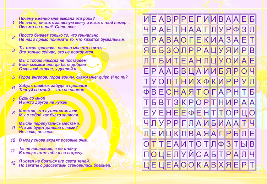 Перед вами 12 строчек из песен, которые можно услышать на танцполах нашего мегаполиса. Вам необходимо угадать песни, после чего найти их названия на буквенном поле, расположенном справа на бланке задания, и выделить их чёткими линиями. Бланк со всеми выделенными словами и список ответов в текстовом виде необходимо прислать в личные сообщения Креативному помощнику Derpy. Рекомендуем загрузить бланк с ответом на хостинг и прикрепить ссылку на изображение для удобства.