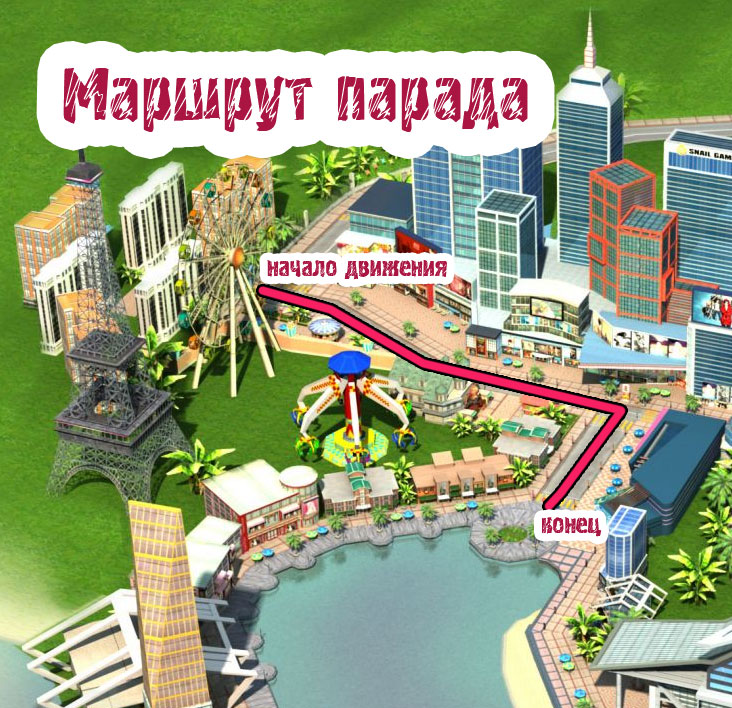 Парад отправится по главной улице города по направлению в набережной. Во время движения не возбраняется, а даже поощряется кричать "Ура!", пускать фейерверки и выражать свою радость любыми другими способами! Перед восхищенными зрителями проследуют колонны автомобильной и мототехники, кавалерия, летающий эскадрон на крыльях и коврах.