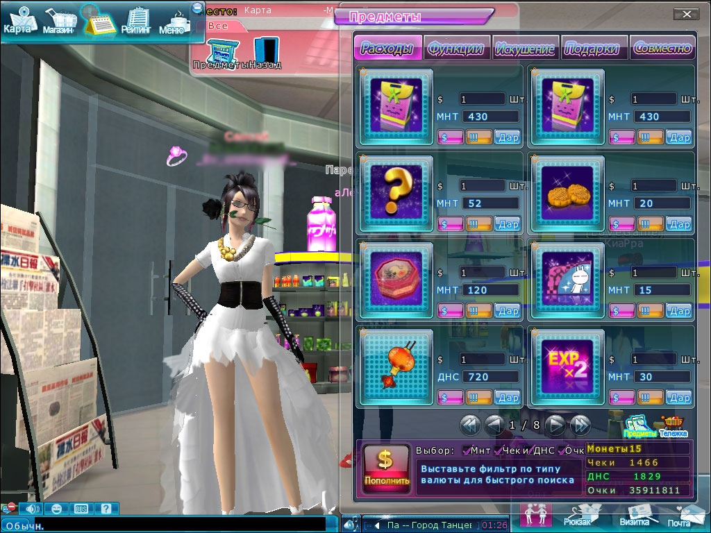 В Городе Танцев ты можешь быстро восстановить силы, взбодриться и повысить энергию. Посмотрите ассортимент магазина «примочек»! Чудотворные вещества, содержащиеся в Призрачном пламени или Волшебном порошке, одним кликом стряхнут усталость. Неважно, новичок ли ты, который пока еще берет уроки танцев, или уже давно стал мастером, известным всем в «Пара Па» — в магазине ты найдешь полезные для себя предметы.