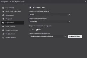 В настройках Игрового центра (кнопка с шестеренкой в правом верхнем углу) на вкладке "Скриншоты" можно увидеть заданное сочетание клавиш, с помощью которого можно делать снимок игрового экрана с выбором области, когда запущен Игровой центр. По умолчанию там задано сочетание "Alt+F3", но можно установить и собственную комбинацию. При нажатии сочетания клавиш появится опция выделения области. Следуйте подсказкам на экране, в результате скриншот автоматически сохранится в папке, которая также указывается в настройках. В играх с полноэкранным режимом данная функция недоступна.