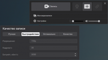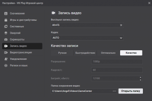 - Качество записи включает в себя набор таких параметров как: разрешение, частота кадров и битрейт. Выбирайте настройки, отталкиваясь от производительности своего компьютера.