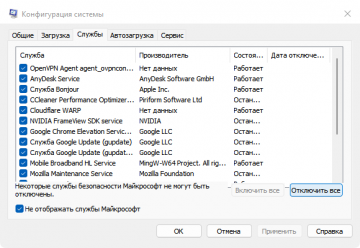 Затем из вкладки '''"Общие"''' нужно перейти на вкладку '''"Службы"''' и поставить галочку в пункте '''"Не отображать службы Майкрософт"'''. Только после этого выбираем '''"Отключить все"''' и жмем '''"ОК"'''. | Затем из вкладки '''"Общие"''' нужно перейти на вкладку '''"Службы"''' и поставить галочку в пункте '''"Не отображать службы Майкрософт"'''. Только после этого выбираем '''"Отключить все"''' и жмем '''"ОК"'''. | ||